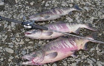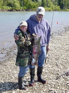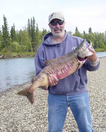 It was decided to head well up the Aniak river to give the fishing poles another try. After several hours and a couple stops, the ideal shoreline was spotted. Cody was the first to get a hit, and he reeled in a nice size chum. Lisa was next with another chum. Thea reported getting the biggest hit which somehow escaped before getting reeled all the way in, but her story was not substantiated by anyone, so you can decide for yourself how much credibility to give to that claim. Soon a familiar hue of yellow was spotted on a boat coming around the bend. Yes, it was George, Lisa, Lita, Darren, and the little one. They stopped and chatted for a bit, and then headed way up river. Mark reeled in the finest fish of the day once he switched to hooking them in the mouth. He decided to bring it back with him for mounting since it was widely speculated that Teresa was saving a special spot on the wall for such a trophy. On the way back, we traded stories with Bob, and some Japanese tourists at the Aniak lodge while eating some of the world famous Aniak Lodge food.