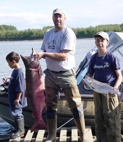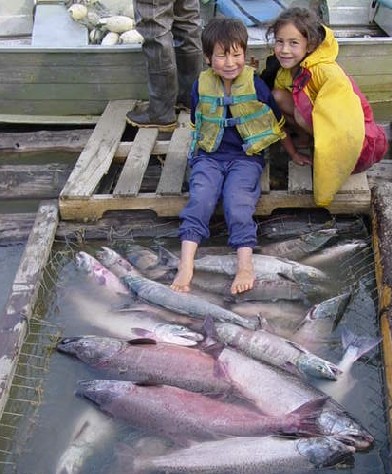 Fishing restrictions on the Kuskokwim were lifted just prior to most guests arriving which greatly increased the opportunity to go after chums, reds, and kings. First order of business was to catch enough fish to feed the guests expected to celebrate Dakota's first communion. Several chums, a red, and a few choice kings were hauled in. Cody particularly enjoyed subduing the more lively fish with the high tech Crow Village fish demobilizer, and improved his efficiency at the task as the catch progressed. Storm provided indications of a possible future career choice in ophthalmology with a methodical investigation of the aquatic optical organs. All in all, a pretty successful outing for the first drift.