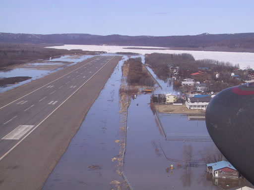 Wednesday morning at 10 am, the water had risen back to it's high mark from the previous day. Water began flowing over the dike in a few spots, but for the most part it was holding good. Officials continued to closely monitor the situation in case they decided they would initiate an evacuation. The "Crow" was readied for evacuation if required. The plan for that evacuation was to navigate from Aniak lodge to the airport using the Crow via shortest route using bolt cutters to negotiate the fence on that route. Aniak shut down electrical power shortly thereafter as a safety measure. As of noon Wednesday, the ice jam was still in place 2 miles downstream from Aniak was continuing to cause flooding in town. The runway was still partially flooded along with some roads. More ice and higher water entered the area from a jam that was released Tuesday in McGrath. Significant flooding remained a possibility. The flood warning was extended until 4pm Thursday.