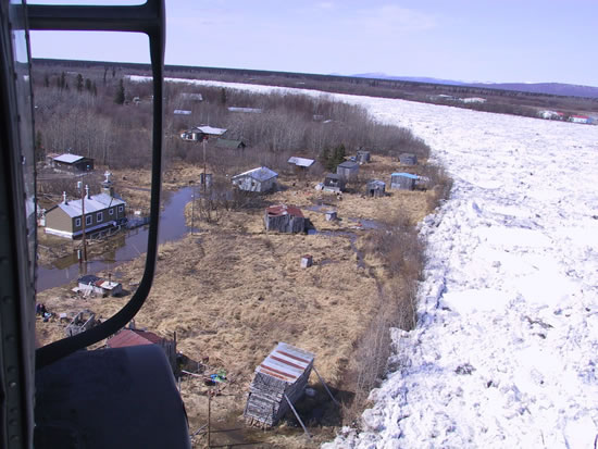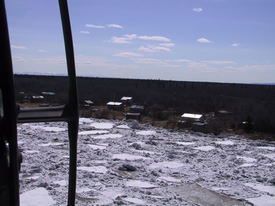 Flooding began in McGrath once the ice jam let loose. The ice chunks cut loose from the recurrent McGrath jams then jammed up at "The Elbow" just past Sleetmute, which is 86 miles upstream from Crow Village. The ice jam broke at Sleetmute Sunday night and the on-rush of water/ice from that event flooded Red Devil just downstream. The town of Red Devil had to be evacuated by helicopter and villages downstream were put on alert.