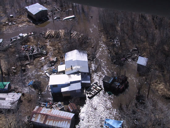 Everyone in Aniak were safe from that first swell, but water and ice are being held precariously by the slightly damaged dike. Another ice jam that had been holding at The Elbow broke on Tuesday and was observed passing the Village of Red Devil at 4 PM Tuesday. Water levels rose about 4 feet as this ice ran past the Village. This ice and water arrived at the upstream end of the jam at Aniak late Tuesday night. Officials began considering evacuating the entire town to either Bethel or Anchorage. Arial surveillance of Crow Village confirmed it was still well above the water level.