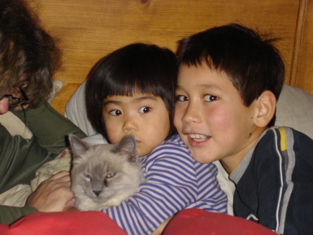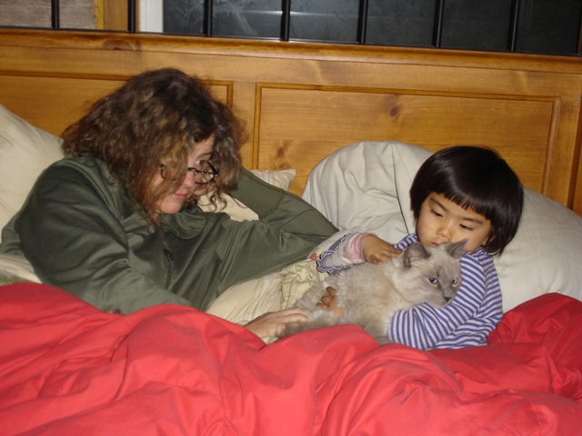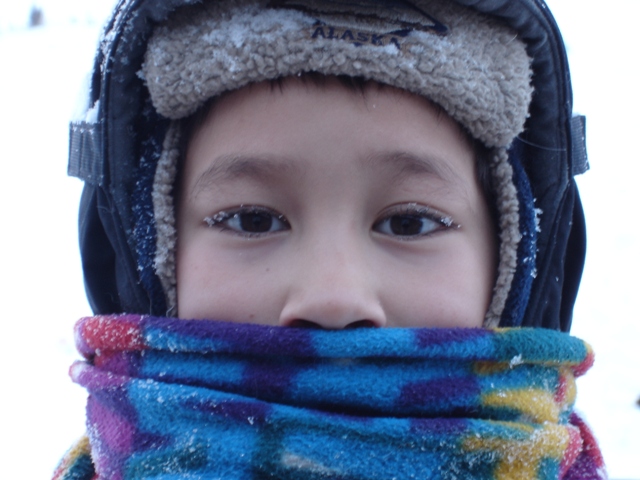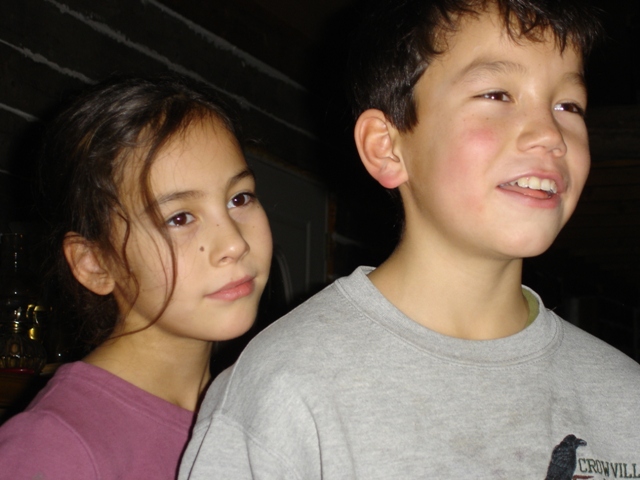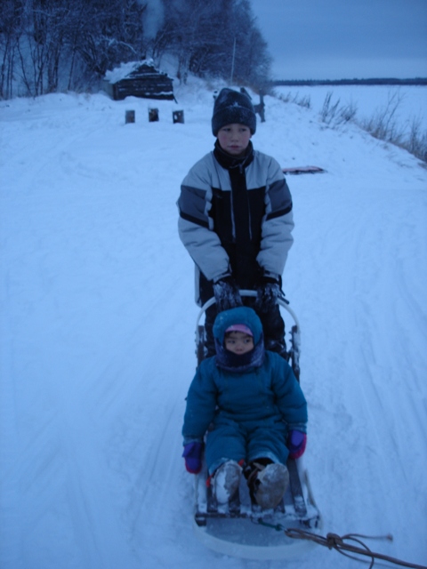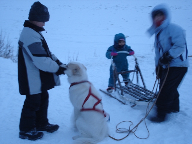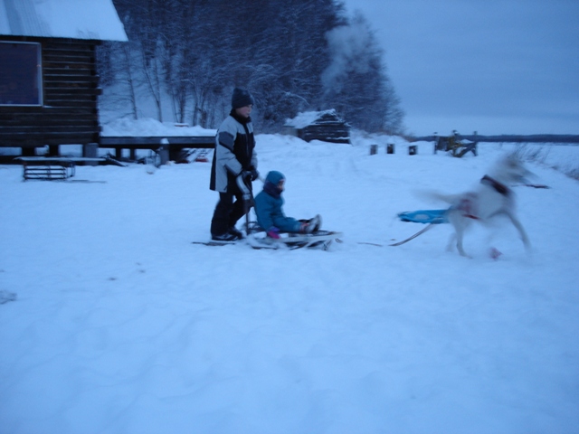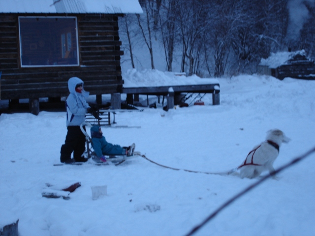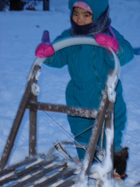 LuLu enjoyed chasing the kitties and playing with the dog and sled yelling "Mush Mellow!" She also like sledding down the hill on the wooden toboggan and riding with Raven on the snow machine in the yard pulling the other kids on the toboggan.